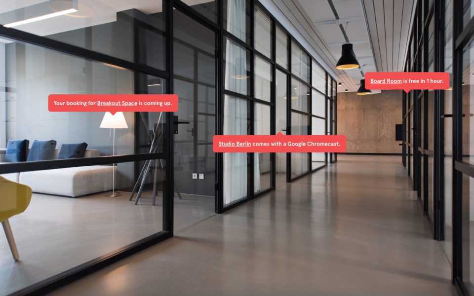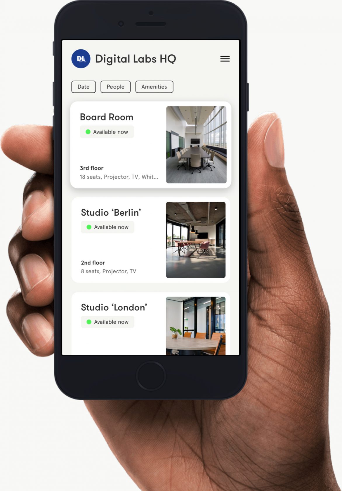 Find the perfect room for your meeting or task at hand. Simply filter the room list by amenities like Apple TV or whiteboard. You can also preselect a space category like meeting room, breakout space or phone booth.