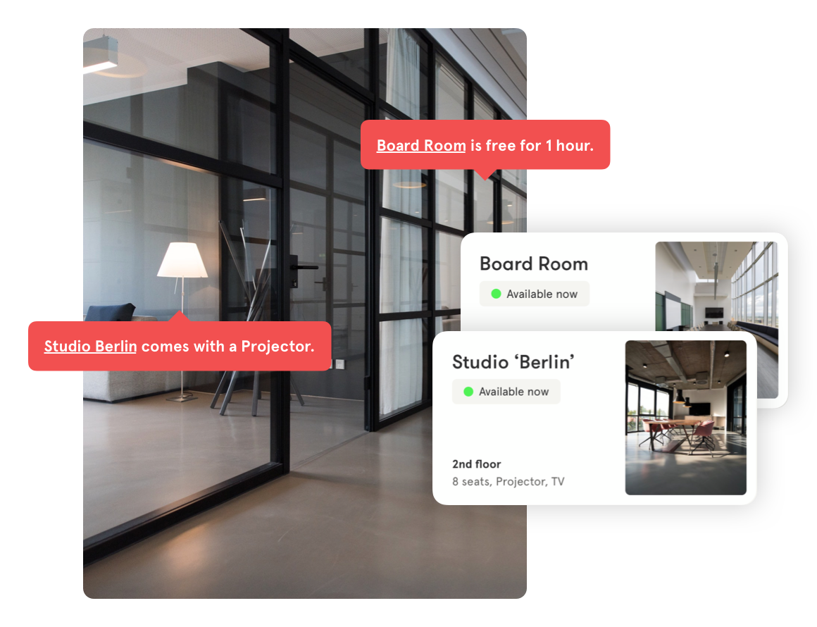 Find the perfect room for your meeting or task at hand. Simply filter the room list by amenities like Apple TV or whiteboard. You can also preselect a space category like meeting room, breakout space or phone booth.